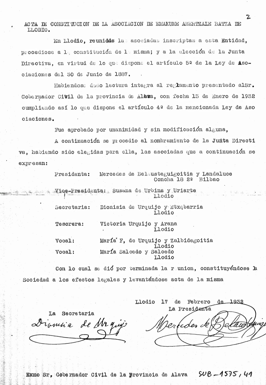 Inmediatamente después de la reorganización de EAB en la primavera de 1931, la dirección de la organización de las emakumes de Bilbao envió copia del reglamento a las integrantes de las capitales del resto de territorios de Hego Euskal Herria y las invitó a crear asociaciones en sus ciudades. La expansión comenzó en las zonas industrializadas, por lo que en el caso de Álava, el de Llodio, junto al de Vitoria-Gasteiz, fueron los grupos más sólidos, con las cifras más altas de afiliadas. EAB de Vitoria-Gasteiz se organizó para octubre de 1931 y la de Llodio para principios de 1932. Los primeros pasos para la creación de EAB de Llodio los dio Eskarne Belaustegigoitia Landaluce. Con fecha 30-12-1931 firmó la solicitud de creación de Emakume Abertzale Batza para su presentación ante el Gobierno civil, junto con las dos copias de la normativa de la EAB de Llodio. Poco después de formalizar la solicitud el 13-01-1932, el 17-02-1932 se reunieron las mujeres de EAB de Llodio, aprobaron por unanimidad el Reglamento y nombraron a su dirección. Presidenta Eskarne Belaustegigoitia, Vicepresidenta Susana Urbina Uriarte; Secretaria Dionisia Urkijo Etxebarria; Tesorera Victoria Urkijo Arana; Vocales Maria F. Urkijo Zalbidegoitia y Maria Salcedo Salcedo. Se organizaron charlas en torno a la construcción nacional (Lauaxeta, Antonio Urrutikoetxea, María Ortiz de Uribe, Polixene Trabudua, Natividad Uribe...), clases de danza, euskera o música vasca.