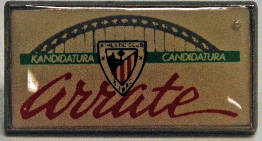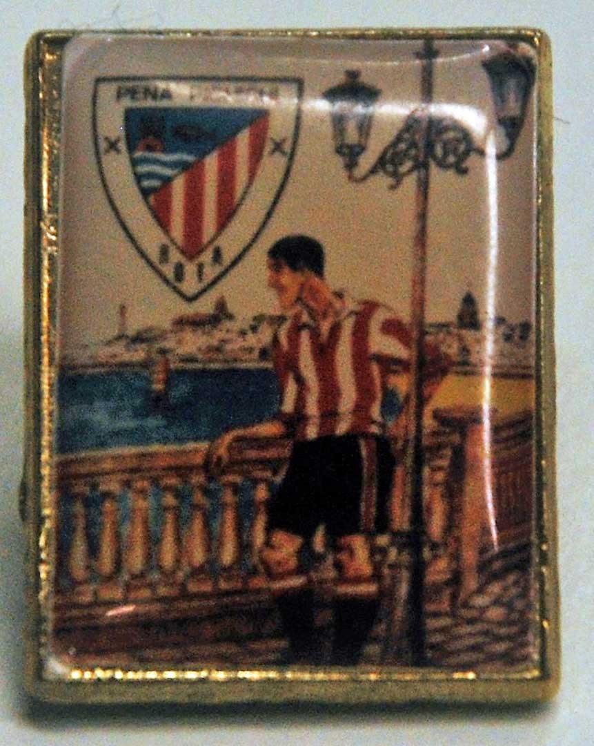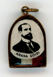 Medalla con la ikurriña, la imagen de Sabino Arana sobre la leyenda "Arana Goiri", con bordes de metal dorado. Donada por Karmele Iriondo Salaberria y conservada en el Museo del Nacionalismo Vasco.