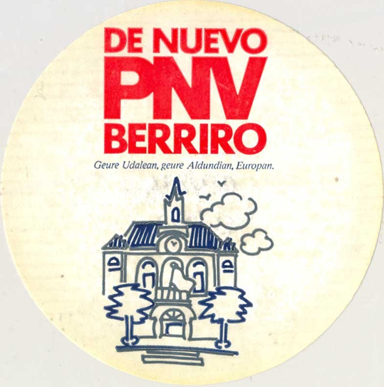 Pegatina con la leyenda "De nuevo PNV berriro geure udalean, geure aldundian, Europan". Donada por Amaia Agirre y conservada en el Museo del Nacionalismo Vasco.