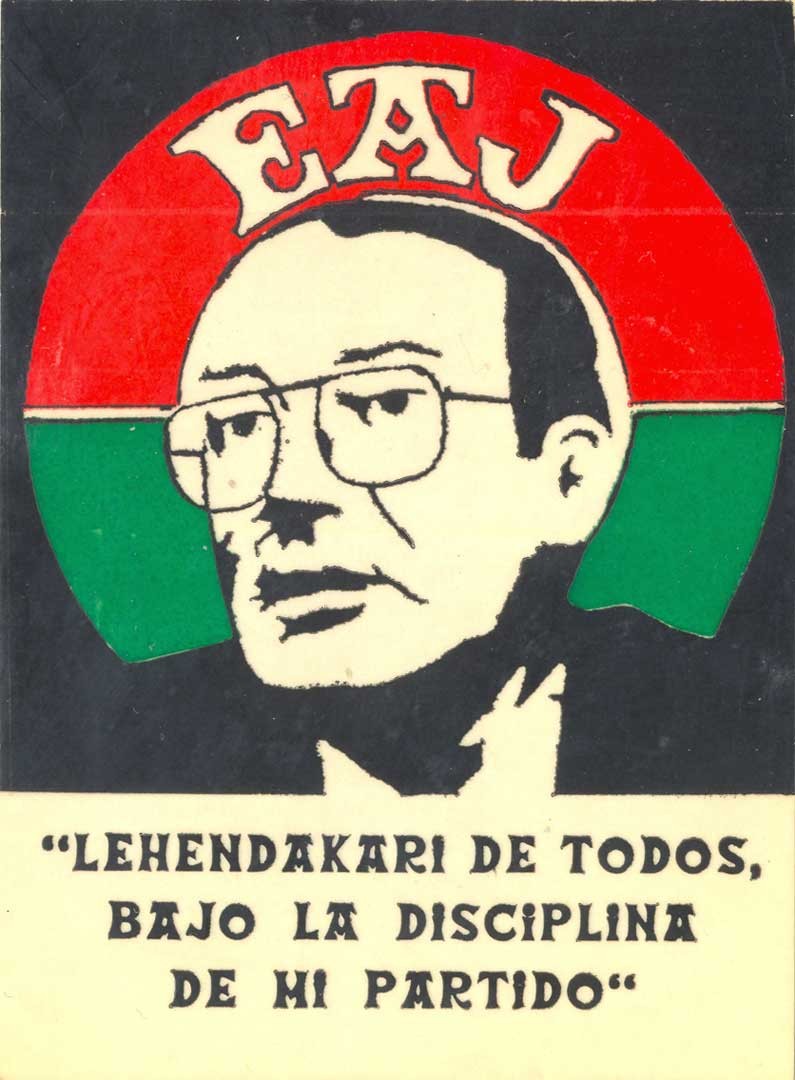Pegatina con la leyenda "EAJ. Lehendakari de todos, bajo la disciplina de mi partido". Donada por Amaia Agirre y conservada en el Museo del Nacionalismo Vasco.