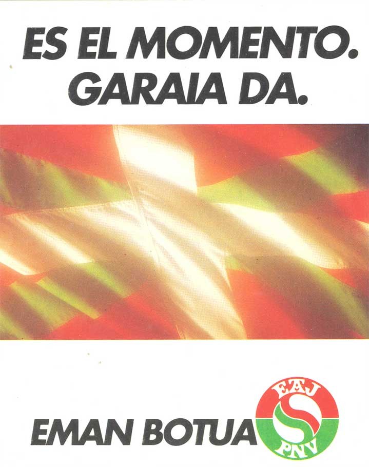 Pegatina con la leyenda "Es el momento. Garaia da. Eman botua EAJ PNV". Donada por Amaia Agirre y conservada en el Museo del Nacionalismo Vasco.