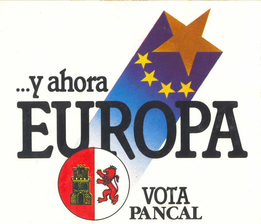 Pegatina con la leyenda "...y ahora Europa Vota pancal.". Donada por Amaia Agirre y conservada en el Museo del Nacionalismo Vasco.