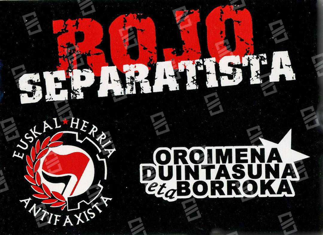 Pegatina con la leyenda "ROJO SEPARATISTA OROIMENA DUINTASUNA ETA BORROKA. EUSKAL HERRIA ANTIFAXISTA".