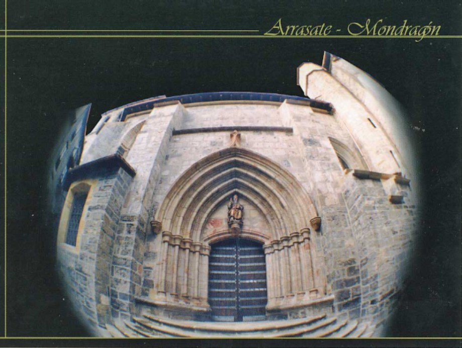 Tarjeta postal de la Iglesia de San Juan, portal de Iturriotz en Mondragón. Donada por Luis Ángel Gainza y conservada en el Museo del Nacionalismo Vasco.
