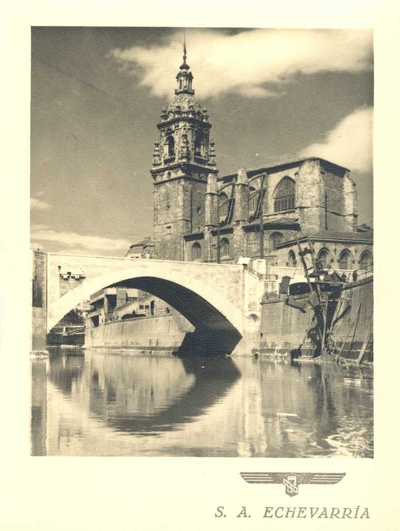 Tarjeta postal en blanco y negro del puente y la iglesia de San Antón de Bilbao. En la parte inferior derecha lleva impreso el logo de la empresa S.A. Echevarría, antigua metalúrgica de Sestao. Donada por Antonio Simón Soto y conservada en el Museo del Nacionalismo Vasco.