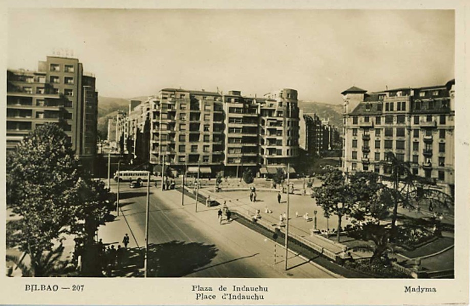 Tarjeta postal de la Plaza de Indauchu (Indautxu) en Bilbao. Donada por Asensio Uria Ibarrondo y conservada en el Museo del Nacionalismo Vasco.
