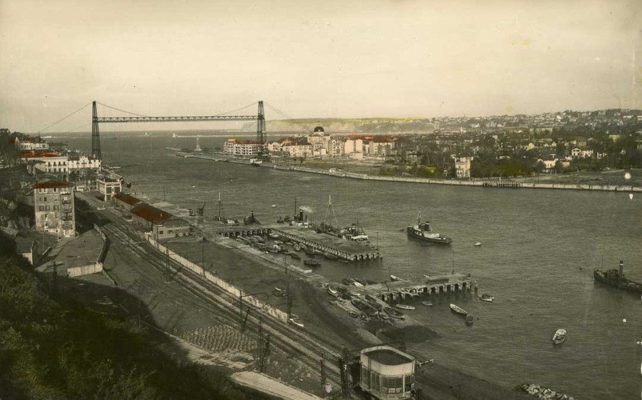 Tarjeta postal en blanco y negro del Puente Bizkaia, también conocido como Puente Colgante, ubicado justo en el lugar donde el mar se encuentra con el Nervión, esta espectacular estructura de hierro une el barrio de Las Arenas y Portugalete. Donada por Rosa María Pérez Baroja y conservada en el Museo del Nacionalismo Vasco.