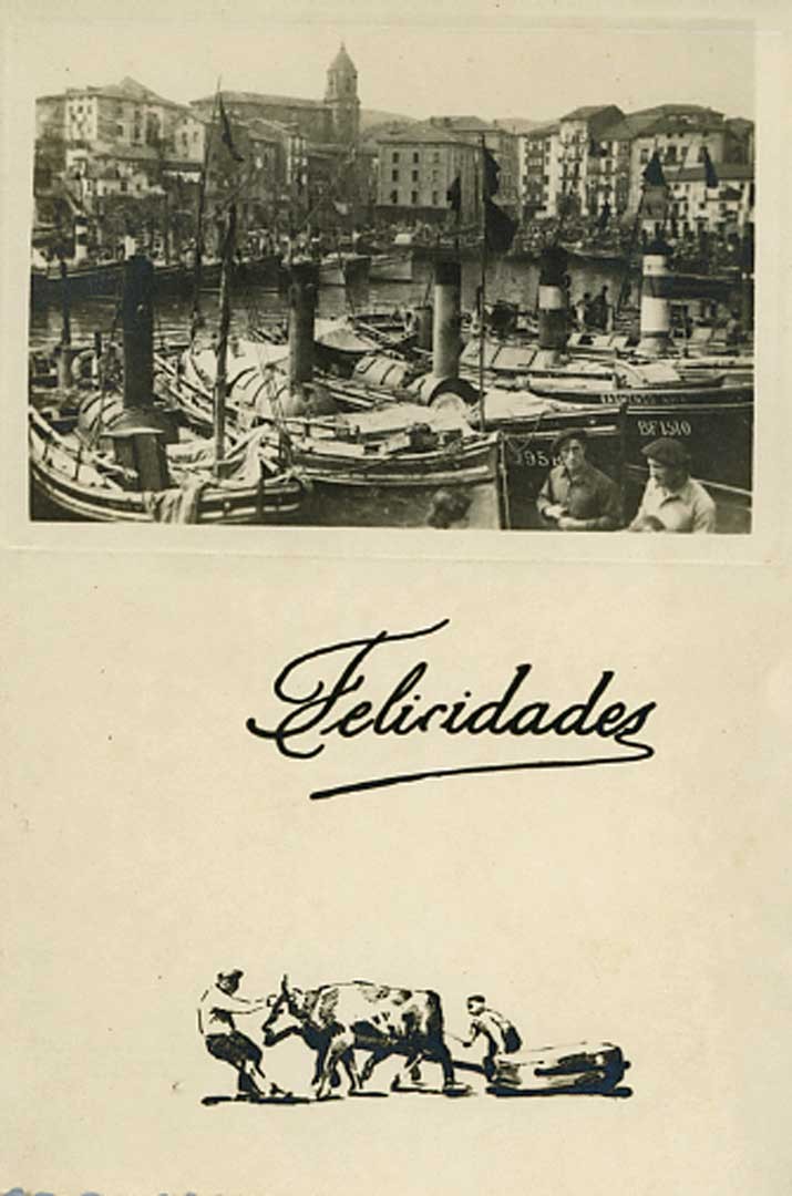 Tarjeta postal del puerto de Bermeo, utilizada como felicitación. Donada por Asensio Uria Ibarrondo y conservada en el Museo del Nacionalismo Vasco.