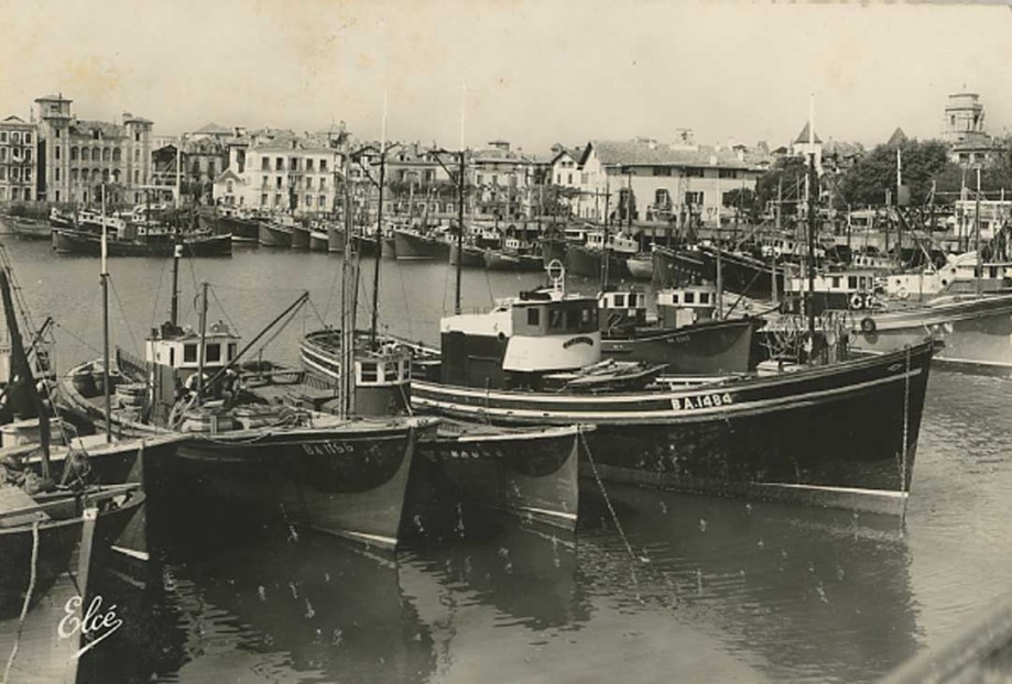Tarjeta postal de los atuneros y arrasteros en el puerto de San Juan de Luz. Conservada en el Museo del Nacionalismo Vasco.