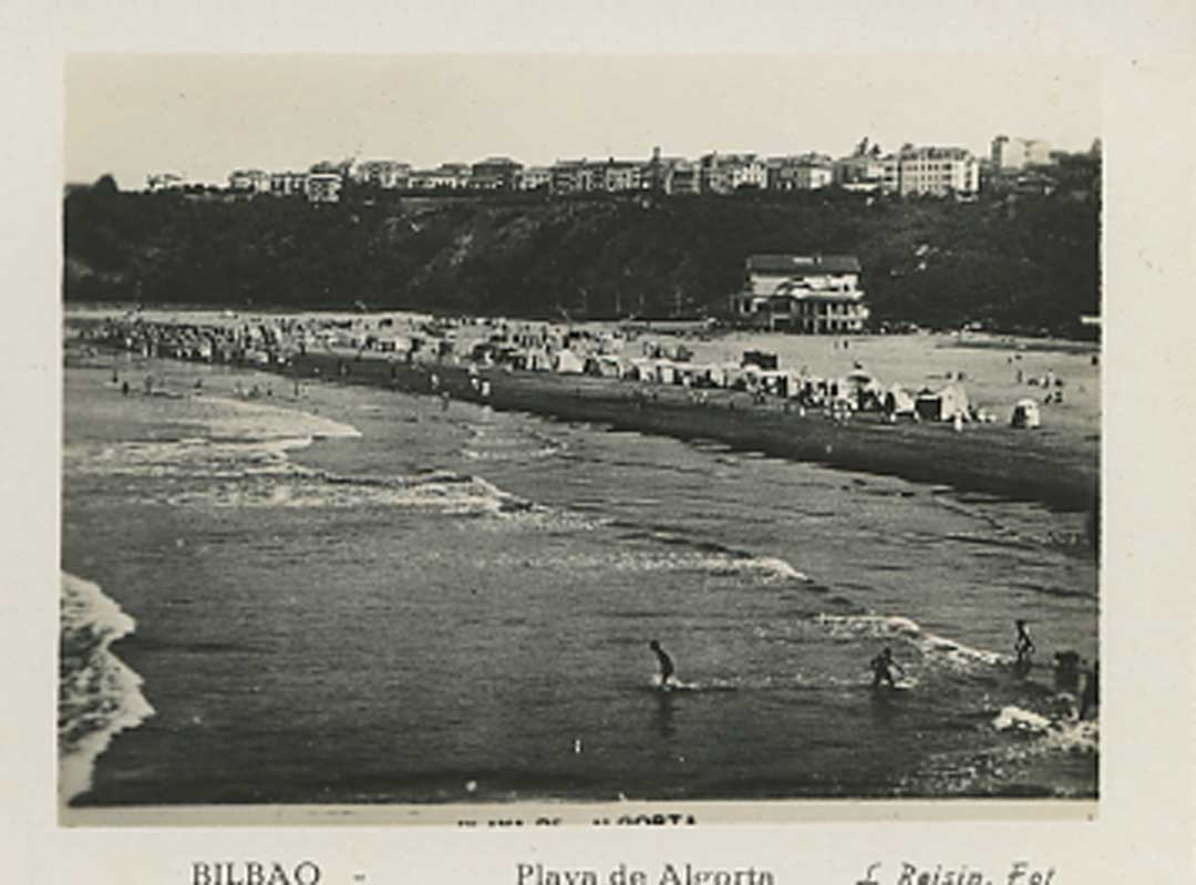 Tarjeta postal de la playa de Algorta, imagen tomada por el fotógrafo francés Lucien Roisin. Conservada en el Museo del Nacionalismo Vasco.