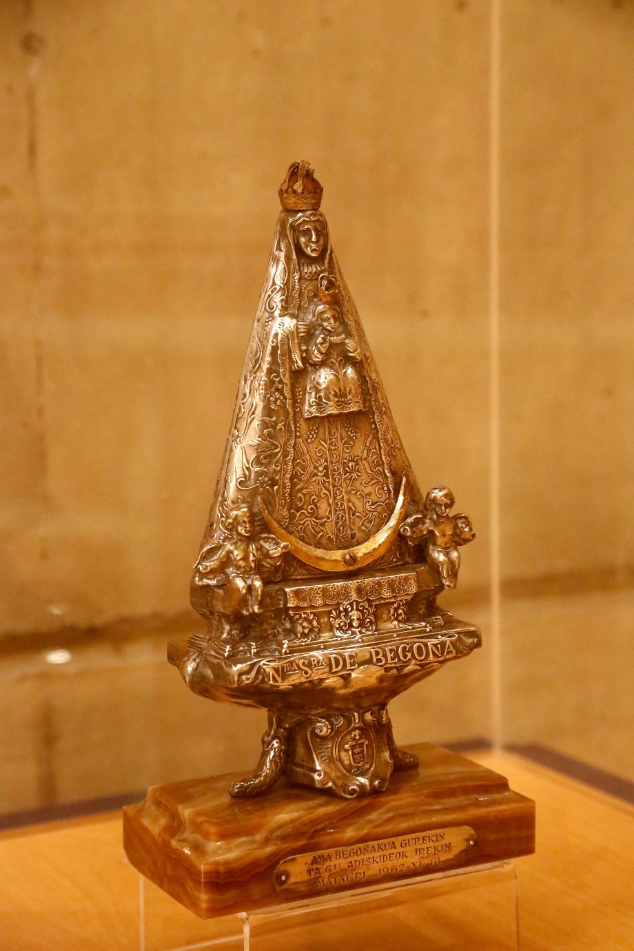 Imagen de la Virgen de Begoña realizada en plata sobre base de mármol, con la leyenda "AMA BEGOÑAKUA GUREKIN TA GU ADISKIDEOK IREKIN MATAI'RI 1962-XI-10".