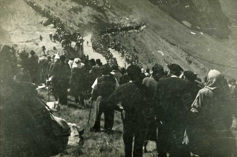 Aficionados en la cima del Tourmalet, esperando la llegada del ciclista en ascenso. Donada por Primi Abad Gorostiza y conservada en el Museo del Nacionalismo Vasco.