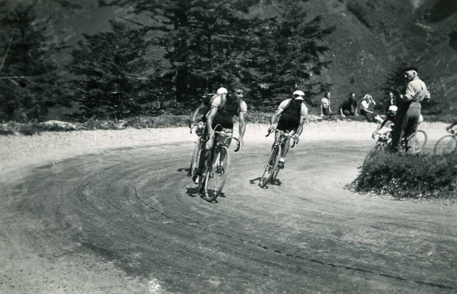 Ciclistas subiendo al Col d'Aubisque en el Tour de Francia. Donada por Carmen Bilbao Ariño y conservada en el Museo del Nacionalismo Vasco.