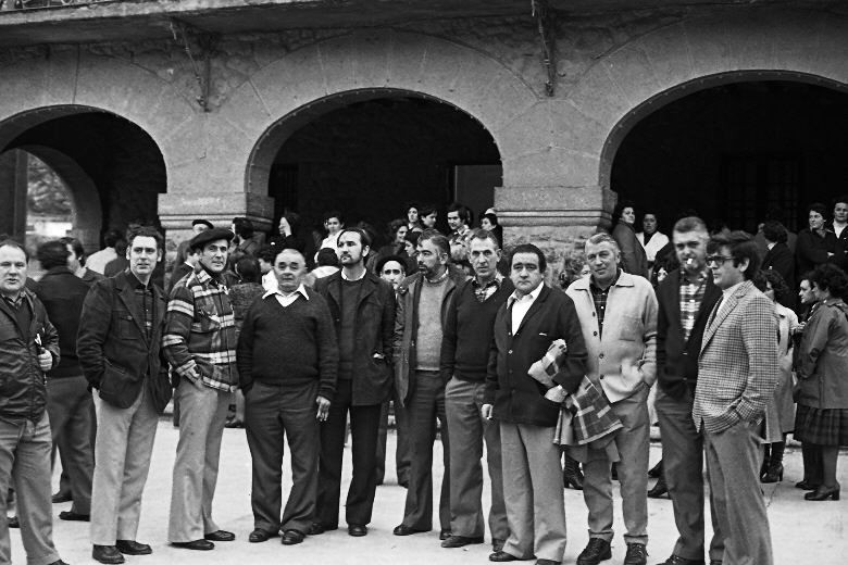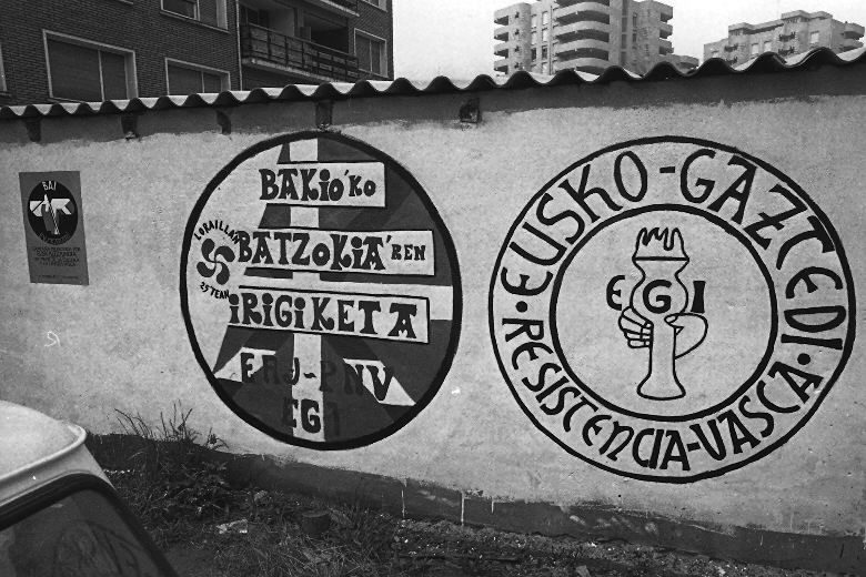 Mural en la localidad de Bakio con tres ilustraciones, en una se hace referencia a la apertura del Batzoki de Bakio, a su derecha aparece el logo de Euzko Gaztedi EGI - Resistencia vasca y a su izquierda un cartel del Jaialdi Bai Euskarari que se realizó en San Mamés ese mismo año.