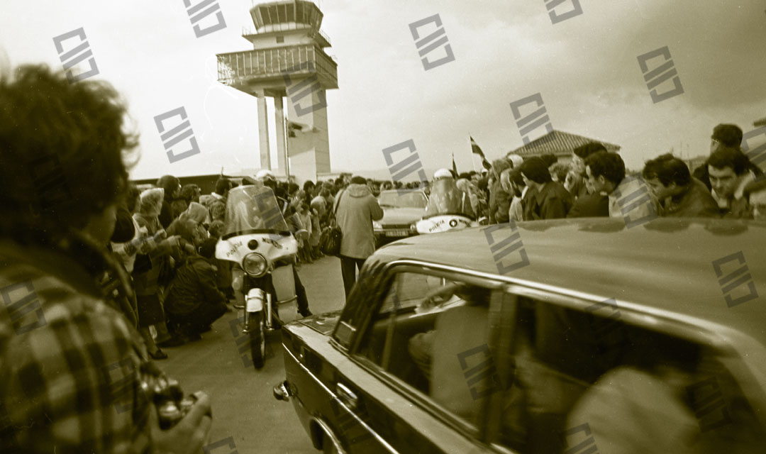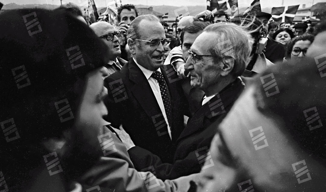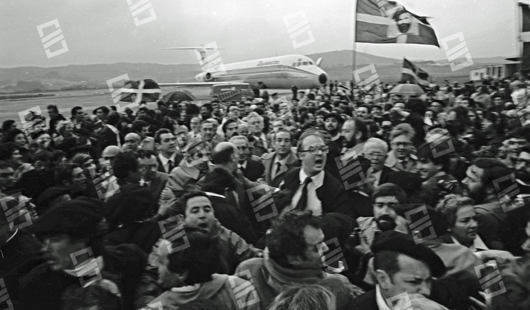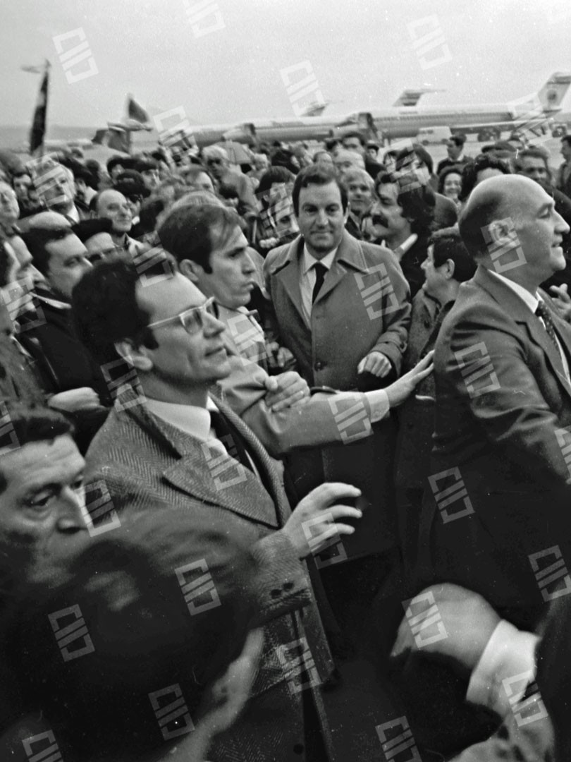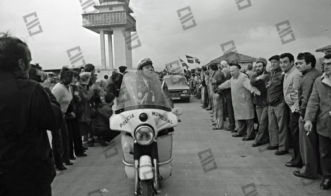 Imagen que recoge el momento del recibimiento multitudinario que recibió el Lehendakari Leizaola a su llegada al aeropuerto de Sondika, entre los que se encuentran: el senador Ramón Sota (que sobresale), el chofer Iñaki Larreategui, José Mª Makua, Diputado General de Bizkaia, Primi Abad, Mitxel Unzueta, Carlos Garaikoetxea presidente del Consejo General Vasco y del EBB, Juan José Pujana Consejero del Consejo General Vasco entre otros. Fecha: 15/12/1979. Nº de inventario: 06/2065.