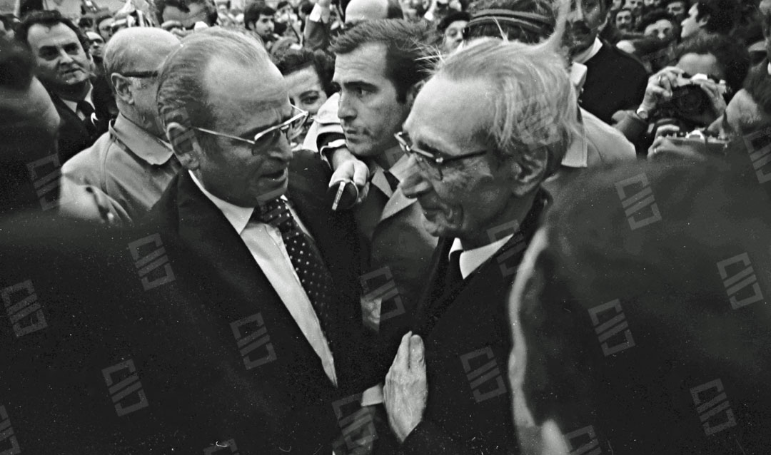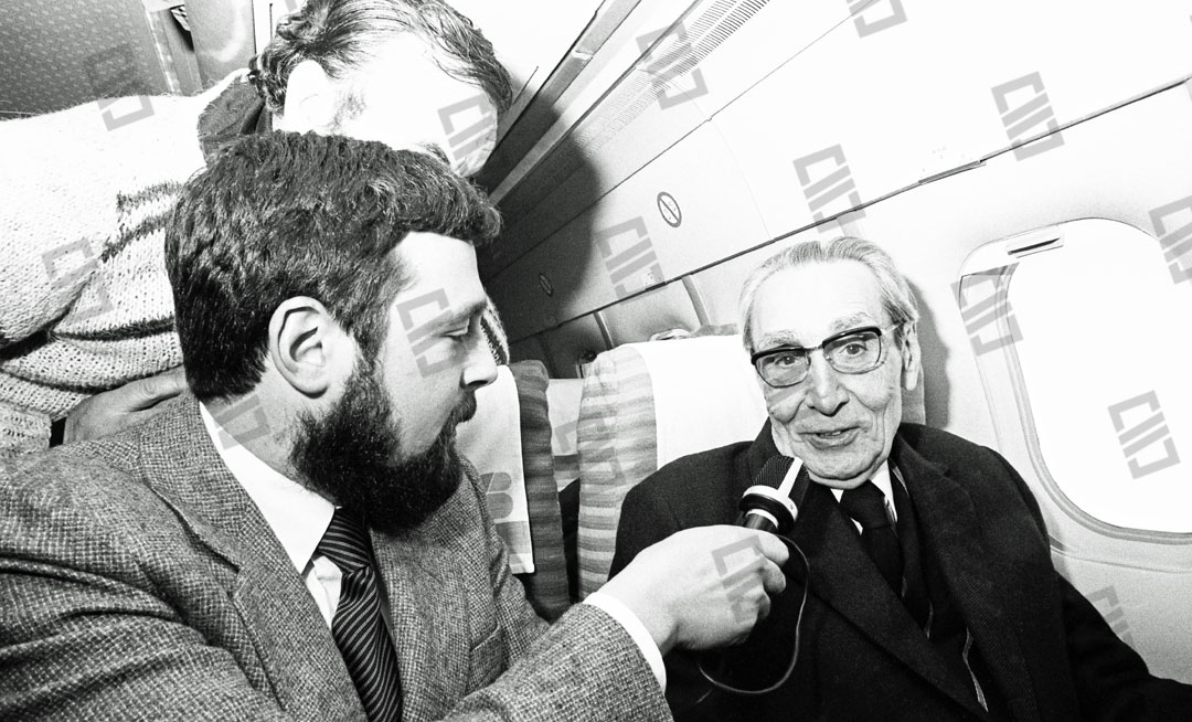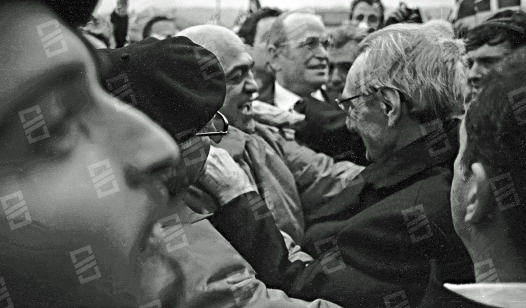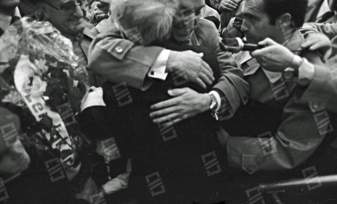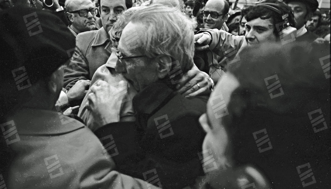 Imagen que recoge el momento del recibimiento multitudinario que recibió el Lehendakari Leizaola a su llegada al aeropuerto de Sondika, entre los que se encuentran: el senador Ramón Sota (que sobresale), el chofer Iñaki Larreategui, José Mª Makua, Diputado General de Bizkaia, Primi Abad, Mitxel Unzueta, Carlos Garaikoetxea presidente del Consejo General Vasco y del EBB, Juan José Pujana Consejero del Consejo General Vasco entre otros. Fecha: 15/12/1979. Nº de inventario: 06/2065.