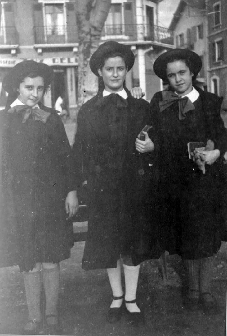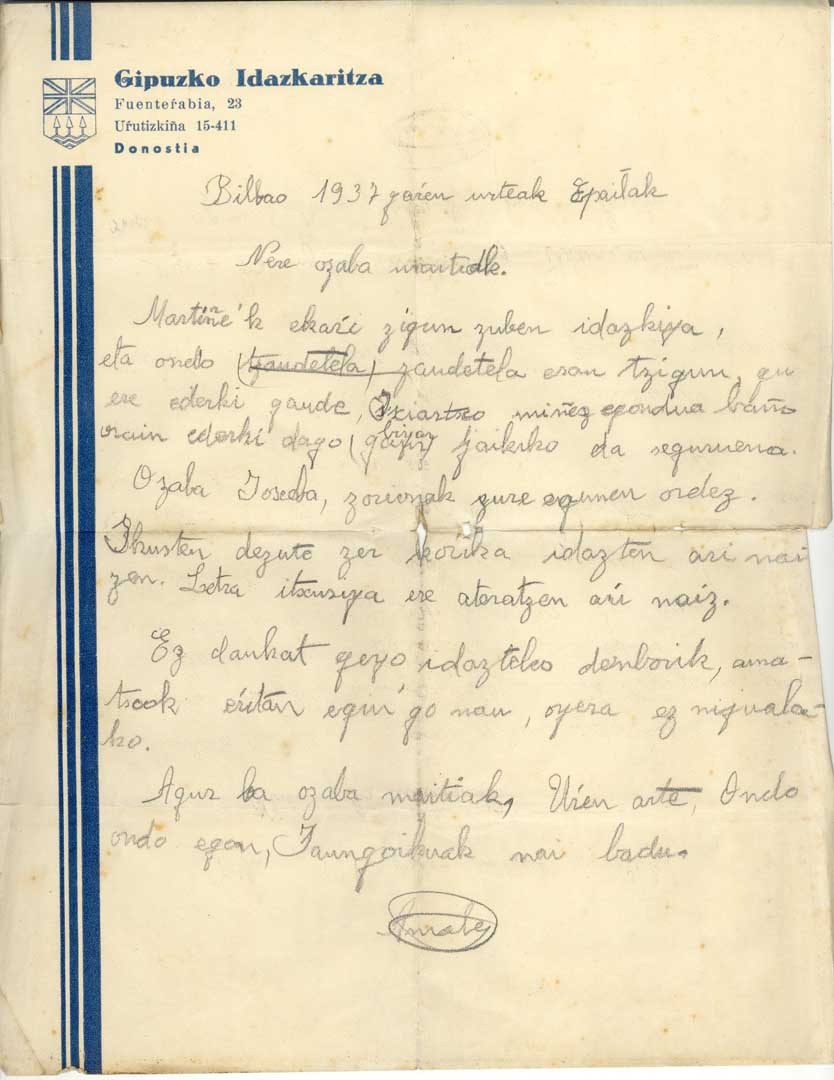 En 1937 durante la guerra actuó en Bilbao en festivales del euskera. Ante la caída de Bilbao en 1937, su ama y sus tres hermanas/os embarcaron en el barco “La Habana” al puerto de “Le Havre” en Francia y de allí viajaron a Iparralde. Vivieron en el exilio entre Askain y Donibane, hasta su vuelta en 1940 a Donostia San Sebastián. En esta época, su padre seguía preso y ella tenía que ayudar en el mantenimiento de la familia, así con 16 años empezó a trabajar, dando clases de euskera y también de francés junto a su ama, maestra de profesión. Por esta razón no pudo seguir con sus estudios , dedicándose a dar “catequesis” a los pequeños en la parroquia de Santa María, y participaba en coros, entre otros la “Schola Cantorum”.