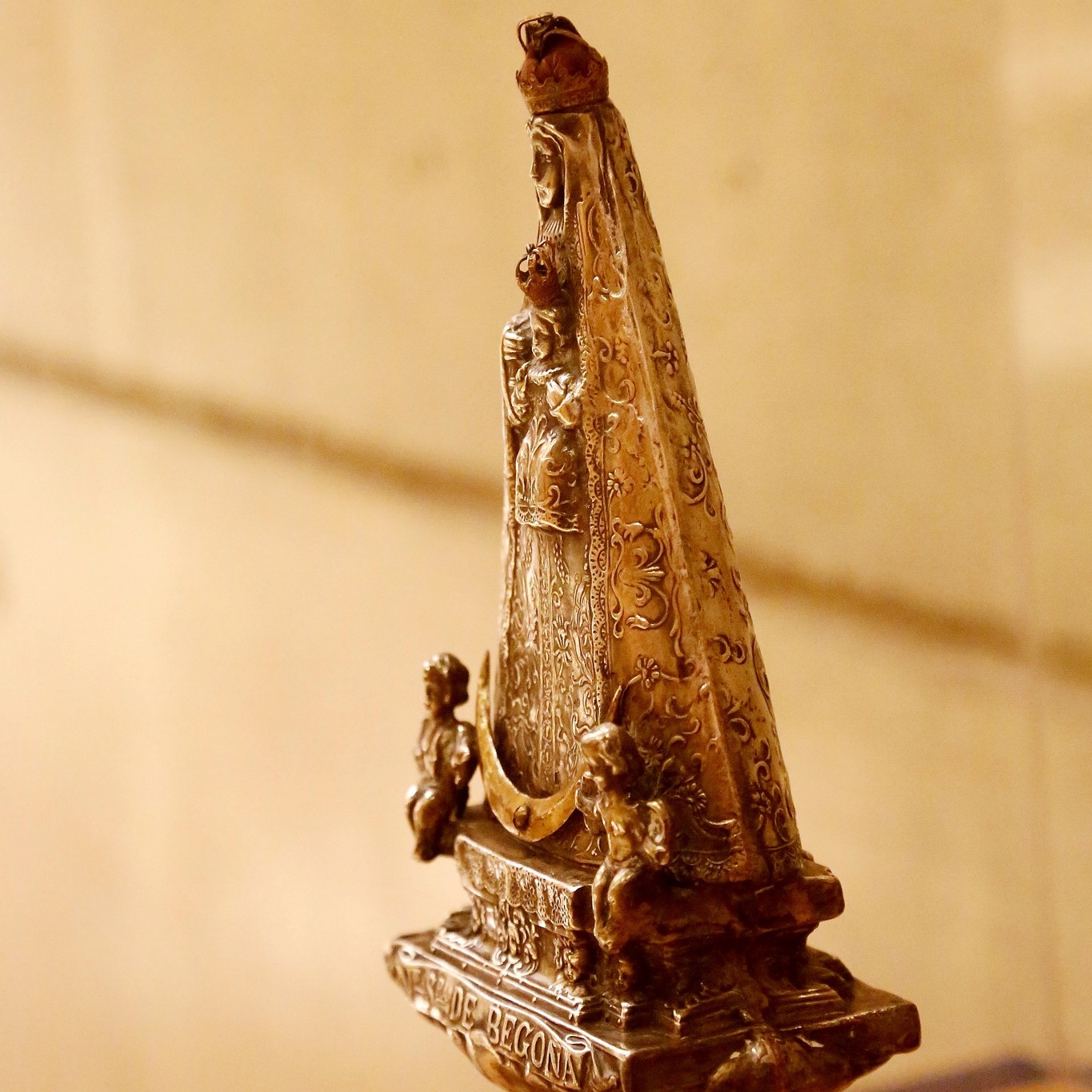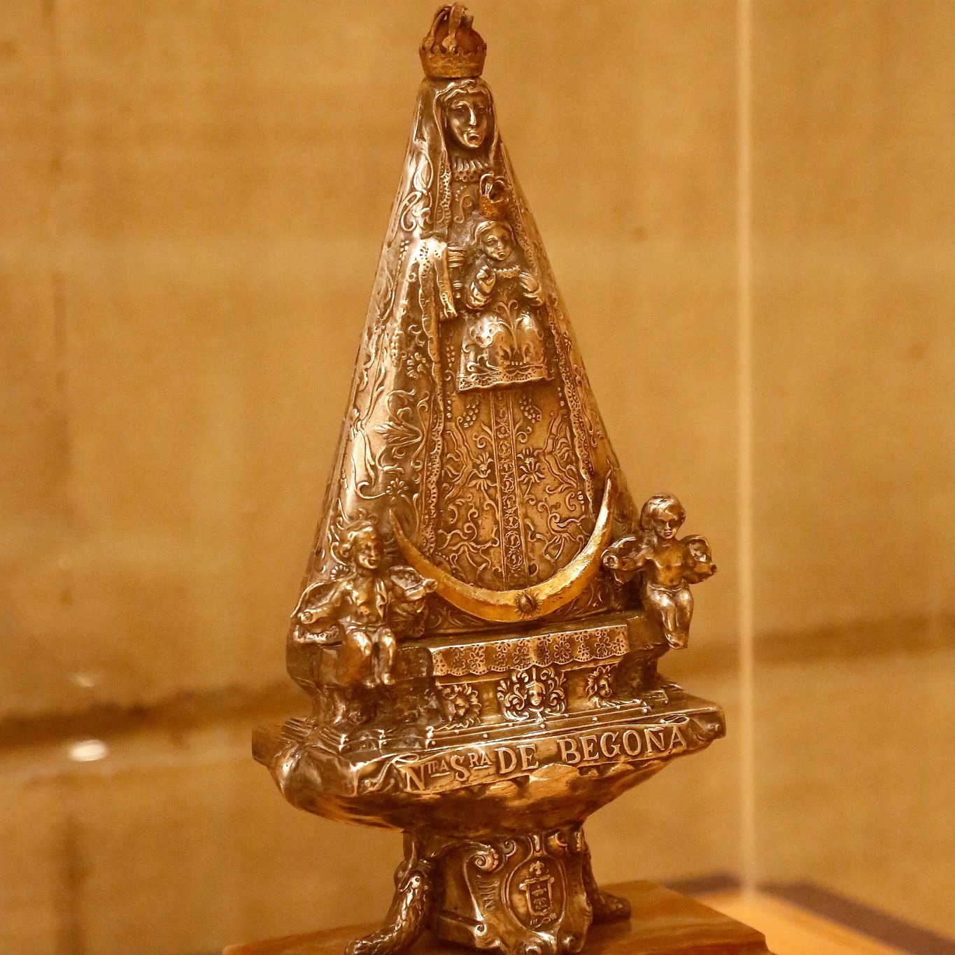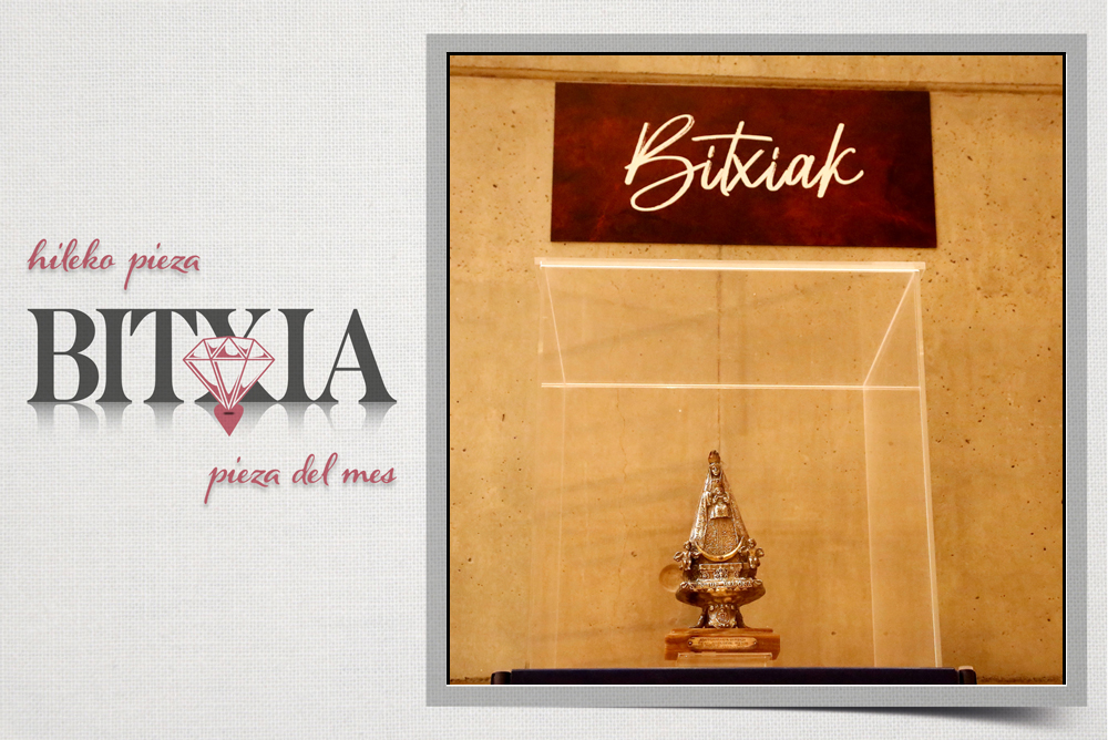 Imagen de la Virgen de Begoña realizada en plata sobre base de mármol, con la leyenda "AMA BEGOÑAKUA GUREKIN TA GU ADISKIDEOK IREKIN MATAI'RI 1962-XI-10".